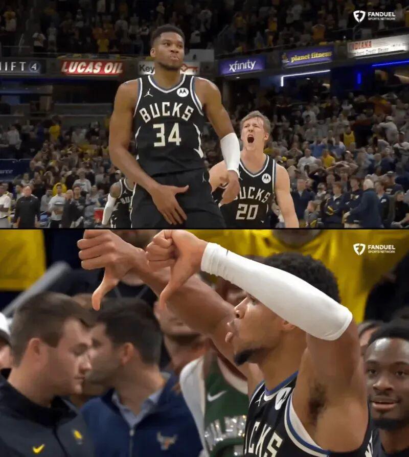 绝杀步行者后,字母哥霸气 向现场步行者球迷倒竖大拇指,随后队友一拥而上。
